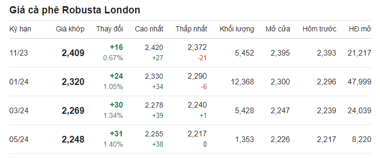 Theo ghi nhận, giá cà phê trên thị trường thế giới biến động trái chiều. Theo đó, giá cà phê trực tuyến robusta tại London giao tháng 11/2023 được ghi nhận tại mức 2.393 USD/tấn sau khi tăng 0,21% (tương đương 5 USD).