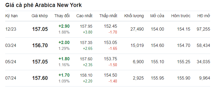 Giá cà phê arabica giao tháng 12/2023 tại New York ở mức 154,15 US cent/pound sau khi giảm 0,48% (tương đương 0,75 US cent) tại thời điểm khảo sát vào lúc 6h50 (giờ Việt Nam).