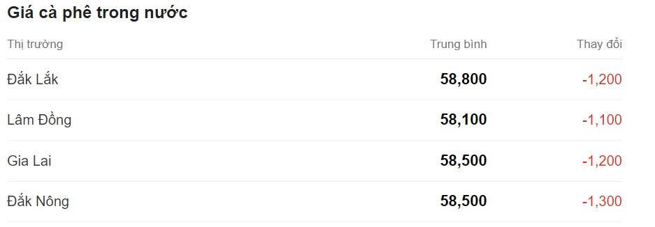 Theo đó, tỉnh Lâm Đồng có giá thấp nhất là 58.100 đồng/kg. Kế đến là tỉnh Gia Lai với 58.500 đồng/kg.