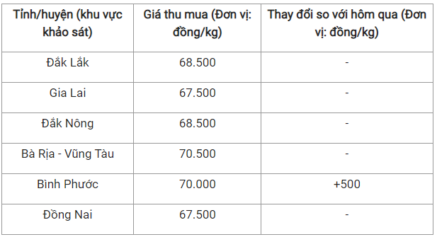Riêng tỉnh Bình Phước điều chỉnh giá tăng nhẹ 500 đồng/kg lên mức 70.000 đồng/kg.