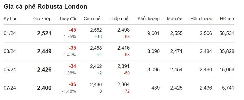 Theo ghi nhận, giá cà phê trên thị trường thế giới giảm. Theo đó, giá cà phê trực tuyến robusta tại London giao tháng 1/2024 được ghi nhận tại mức 2.521 USD/tấn sau khi giảm 1,75% (tương đương 45 USD).