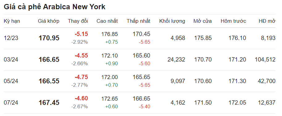 Giá cà phê arabica giao tháng 12 tại New York ở mức 170,95 US cent/pound sau khi giảm 2,92% (tương đương 5,15 US cent) tại thời điểm khảo sát vào lúc 7h10 (giờ Việt Nam).