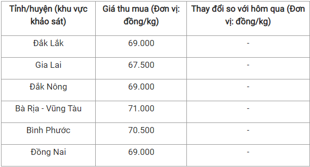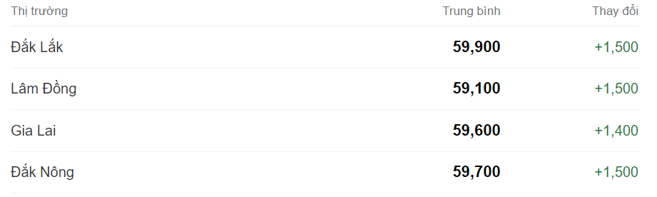 Theo đó, tỉnh Lâm Đồng có giá thấp nhất là 59.100 đồng/kg. Kế đến là tỉnh Gia Lai với 59.600 đồng/kg.