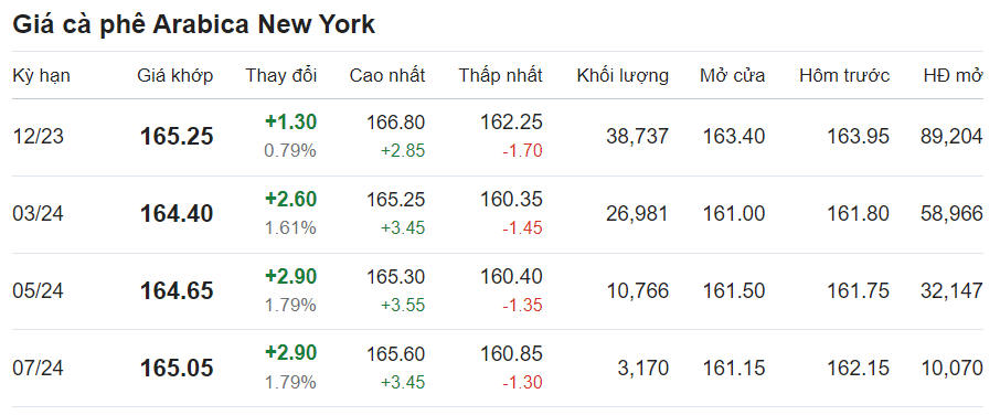 Giá cà phê arabica giao tháng 12/2023 tại New York ở mức 165,25 US cent/pound sau khi tăng 0,79% (tương đương 1,3 US cent) tại thời điểm khảo sát vào lúc 7h20 (giờ Việt Nam).