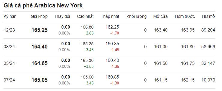 Giá cà phê arabica giao tháng 12/2023 tại New York ở mức 165,25 US cent/pound sau khi tăng 0,79% (tương đương 1,3 US cent) tại thời điểm khảo sát vào lúc 7h10 (giờ Việt Nam).