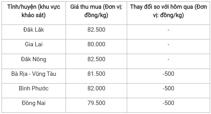 Chi tiết như sau, tỉnh Đồng Nai đang có mức giá thu mua là 79.500 đồng/kg - giảm 500 đồng/kg, trong khi Gia Lai có giá ổn định ở mức 80.000 đồng/kg.