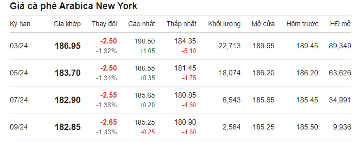 Giá cà phê arabica giao tháng 3/2024 tại New York ở mức 185,25 US cent/pound sau khi tăng 2,92% (tương đương 5,25 US cent) tại thời điểm khảo sát vào lúc 6h40 (giờ Việt Nam).