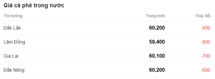 Giá cà phê cao nhất thu mua ở các vùng trọng điểm của Tây Nguyên (Đắk Lắk, Lâm Đồng, Gia Lai, Đắk Nông, Kon Tum) được ghi nhận ở mức 60.200 đồng/kg.