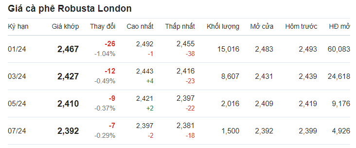 Theo ghi nhận, giá cà phê trên thị trường thế giới giảm. Theo đó, giá cà phê trực tuyến robusta tại London giao tháng 11/2023 được ghi nhận tại mức 2.467 USD/tấn sau khi giảm 1,04% (tương đương 26 USD).