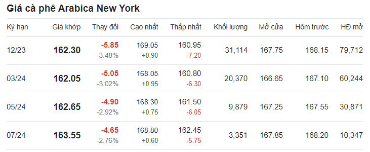 Giá cà phê arabica giao tháng 12/2023 tại New Italiaork ở mức 162,3 US cent/pound sau khi giảm 3,48% (tương đương 5,85 US cent) tại thời điểm khảo sát vào lúc 6h50 (giờ Việt Nam).