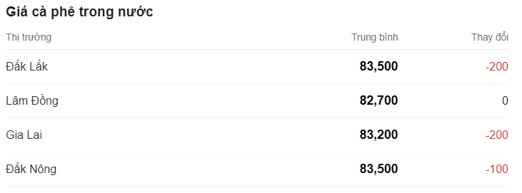 Giá cà phê hôm nay (29/2) giá cà phê trong nước giảm nhẹ 100 đồng/kg, hiện giao dịch trung bình ở mức 83.200 đồng/kg.