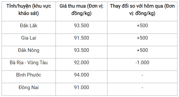 Cụ thể, mức giá được ghi nhận tại tỉnh Đồng Nai là 91.000 đồng/kg - không đổi và tỉnh Gia Lai có giá là 91.500 đồng/kg - tăng 500 đồng/kg.