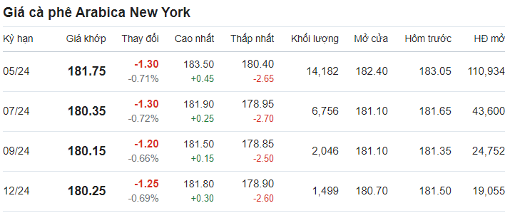 Giá cà phê arabica giao tháng 5/2024 tại New York ở mức 182,05 US cent/pound sau khi giảm 0,55% (tương đương 1 US cent) tại thời điểm khảo sát vào lúc 6h (giờ Việt Nam).