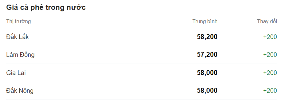 Giá cà phê cao nhất thu mua ở các vùng trọng điểm của Tây Nguyên (Đắk Lắk, Lâm Đồng, Gia Lai, Đắk Nông, Kon Tum) được ghi nhận ở mức 58.200 đồng/kg.