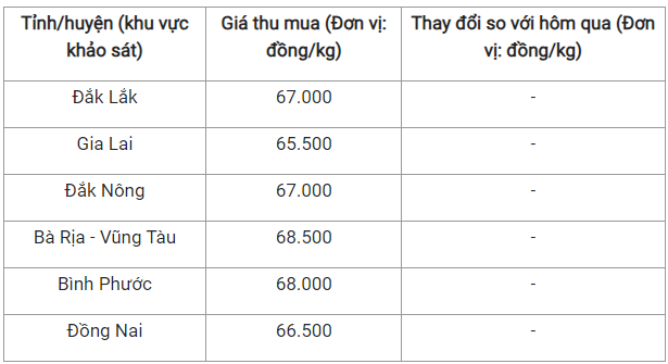 Kế đến là hai tỉnh Đắk Lắk và Đắk Nông với mức giá không đổi 67.000 đồng/kg.