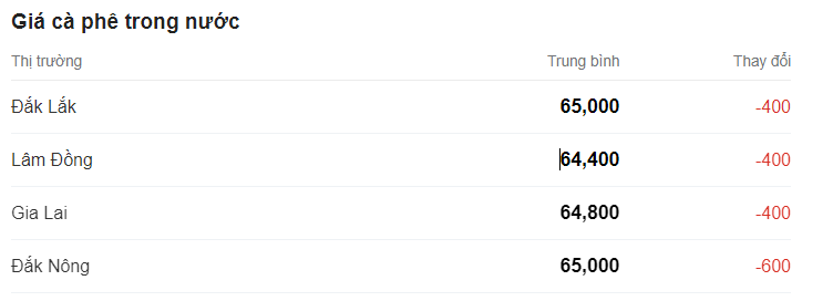 Giá cà phê hôm nay (5/10) giá cà phê trong nước tiếp tục giảm từ 400 - 600 đồng/kg, hiện giao dịch trung bình ở mức 64.400 – 65.000 đồng/kg.
