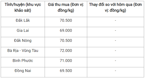 Cụ thể, mức giá thu mua thấp nhất hiện được ghi nhận tại tỉnh Gia Lai là 69.000 đồng/kg. Tiếp đến là Đồng Nai với mức giá 69.500 đồng/kg.