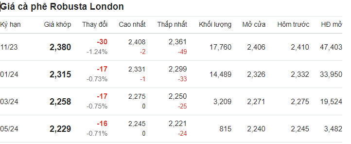 Theo ghi nhận, giá cà phê trên thị trường thế giới giảm. Theo đó, giá cà phê trực tuyến robusta tại London giao tháng 11/2023 được ghi nhận tại mức 2.380 USD/tấn sau khi giảm 1,24% (tương đương 30 USD).