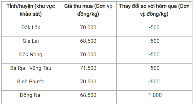 Cụ thể, mức giá được ghi nhận tại hai tỉnh Gia Lai và Đồng Nai là 68.500 đồng/kg, lần lượt giảm 500 đồng/kg và 1.000 đồng/kg.
