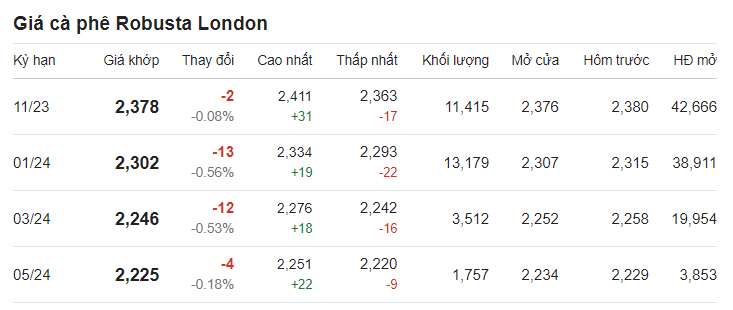 Theo ghi nhận, giá cà phê trên thị trường thế giới giảm. Theo đó, giá cà phê trực tuyến robusta tại London giao tháng 11/2023 được ghi nhận tại mức 2.378 USD/tấn sau khi giảm 0,08% (tương đương 2 USD).