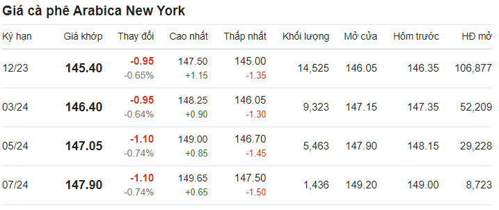 Giá cà phê arabica giao tháng 12/2023 tại New York ở mức 145,4 US cent/pound sau khi giảm 0,65% (tương đương 0,95 US cent) tại thời điểm khảo sát vào lúc 6h40 (giờ Việt Nam).