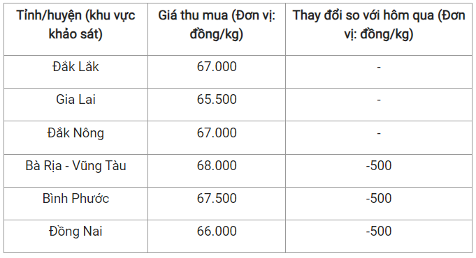 Hiện tại, hai tỉnh Gia Lai và Đồng Nai lần lượt ghi nhận mức giá thu mua là 65.500 đồng/kg và 66.000 đồng/kg.