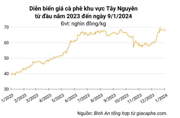 Theo đó, tỉnh Lâm Đồng có giá thấp nhất là 67.800 đồng/kg, tiếp đó là Gia Lai với giá 68.500 đồng/kg, cùng tăng 100 đồng/kg.