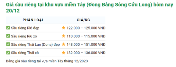 | Giá sầu riêng Ri6 cuối vụ tăng cao Giá sầu riêng hôm nay 10/12: Sầu riêng Ri6 liên tục tăng cao Giá sầu riêng ngày 13/12: Sầu riêng Ri6 được thu mua 127.000 đồng/kg |