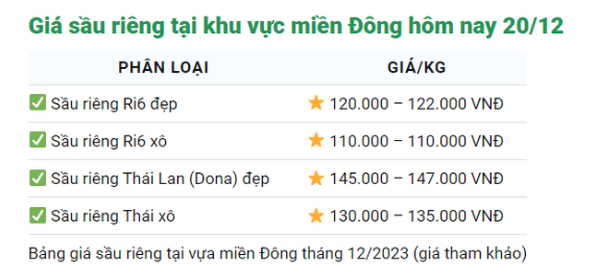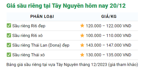 Dưới đây là bảng giá sầu riêng hôm nay 20/12. Tùy theo độ dài đường vận chuyển hay khu vực vận chuyển mà giá sầu riêng sẽ có sự chênh lệch ít nhiều.