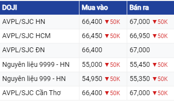 Giá vàng SJC tại Tập đoàn Doji, niêm yết trên thị trường Hà Nội, mua - bán quanh mức 66,4 – 67 triệu đồng/lượng, giảm 50.000 đồng/lượng cả chiều mua vào và chiều bán ra so với chốt phiên trước. Chênh lệch mua - bán là 600.000 đồng/lượng.