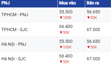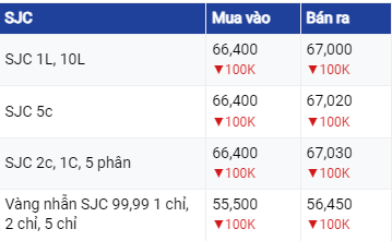Tại Hà Nội và Đà Nẵng, giá vàng SJC giao dịch mua - bán trong khoảng 66,4 – 67,02 triệu đồng/lượng. Các thị trường trên đều giảm mạnh 100.000 đồng/lượng cả chiều mua và chiều bán ra so với chốt phiên trước. Chênh lệch mua – bán là 600.000 đồng/lượng.
