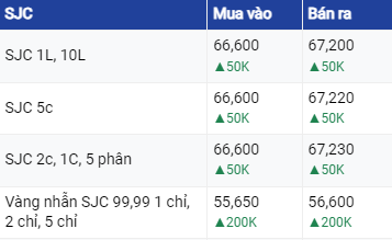 Cụ thể, giá vàng SJC tại Công ty SJC (Hà Nội) niêm yết ở mức 66,60 - 67,20 triệu đồng/lượng (mua vào - bán ra); tăng 50 ngàn đồng/lượng ở chiều mua và bán.