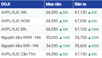 Giá vàng DOJI tại Hà Nội đang niêm yết ở ngưỡng 66,55 - 67,15 triệu đồng/lượng (mua vào - bán ra); tăng 50 ngàn đồng/lượng ở chiều mua và bán.