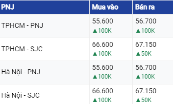Giá vàng PNJ tại Hà Nội và TP.HCM giao dịch ở mức 66,60 - 67,15 triệu đồng/lượng (mua vào - bán ra); tăng 100 ngàn đồng/lượng ở chiều mua và tăng 50 ngàn đồng/lượng ở chiều bán.