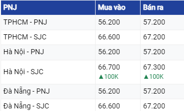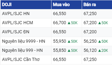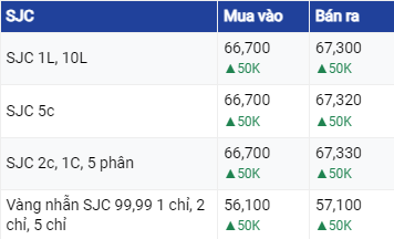 Tại Hà Nội và Đà Nẵng, giá vàng SJC giao dịch mua - bán trong khoảng 66,7 – 67,32 triệu đồng/lượng. Các thị trường trên đều tăng 50.000 đồng/lượng chiều mua và chiều bán ra so với chốt phiên trước. Chênh lệch mua – bán thu hẹp về 600.000 đồng/lượng. So với giá mở cửa phiên sáng qua, các thị trường trên đã tăng 100.000 đồng/lượng.