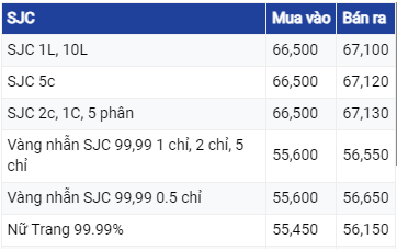 Cụ thể, giá vàng SJC tại Công ty SJC (Hà Nội) niêm yết ở mức 66,50 - 67,10 triệu đồng/lượng (mua vào - bán ra)