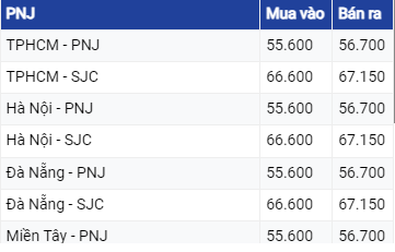 Giá vàng Phú Quý SJC đang niêm yết mức 66,50 triệu đồng/lượng mua vào và 67,10 triệu đồng/lượng bán ra. Vàng PNJ đang mua vào ở mức 66,6 triệu đồng/ lượng và bán ra mức 67,15 triệu đồng/ lượng. Giá vàng miếng tại Bảo Tín Minh Châu giao dịch ở mức 66,52 - 67,08 triệu đồng/lượng (mua vào - bán ra).