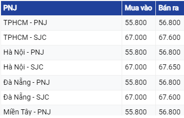 Giá vàng PNJ ở khu vực TP Hồ Chí Minh niêm yết ở mức 67 triệu đồng/lượng mua vào và 67,6 triệu đồng/lượng bán ra, tăng 100.000 đồng ở chiều mua và chiều bán so với rạng sáng trước đó. Tại Hà Nội, vàng thương hiệu này đang mua vào ở mức tương tự nhưng bán ra cao hơn 50.000 đồng so với khu vực TP Hồ Chí Minh.