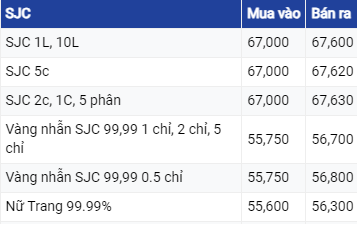 Giá vàng SJC ở khu vực Hà Nội và Đà Nẵng đã được điều chỉnh tăng cùng mức 100.000 đồng ở chiều mua và chiều bán lên mức 67 triệu đồng/lượng (mua vào) và mức giá 67,62 triệu đồng/lượng (bán ra). Tại TP Hồ Chí Minh, vàng SJC vẫn đang mua vào mức tương tự như ở khu vực Hà Nội và Đà Nẵng nhưng bán ra thấp hơn 20.000 đồng.
