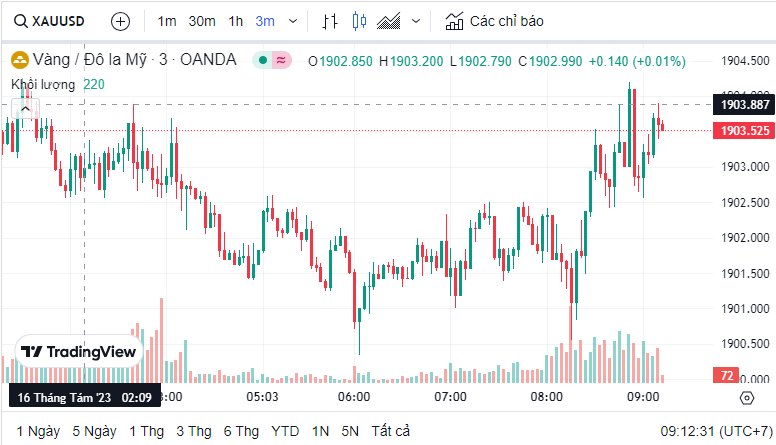 Giá vàng quốc tế (XAU) hôm nay là 1,903.69 USD (cập nhật lúc 09:10:58 16/08/2023).