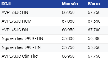 Giá vàng DOJI tại khu vực Hà Nội được niêm yết ở mức 66,95 triệu đồng/lượng mua vào và 67,75 triệu đồng/lượng bán ra. Tại TP Hồ Chí Minh, vàng thương hiệu này đang mua vào mức cao hơn 100.000 đồng nhưng bán ra thấp hơn 100.000 đồng so với khu vực Hà Nội.