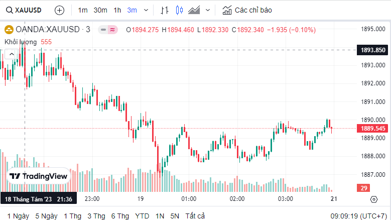 Giá vàng quốc tế (XAU) hôm nay là 1,889.52 USD (cập nhật lúc 09:07:42 20/08/2023).