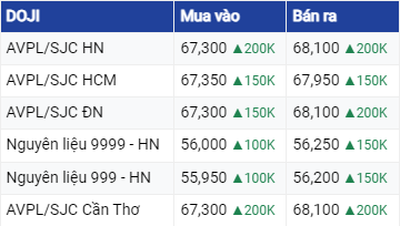 Giá vàng DOJI tại khu vực Hà Nội đã được điều chỉnh tăng 200.000 đồng ở cả 2 chiều lên lần lượt 67,3 triệu đồng/lượng mua vào và 68,1 triệu đồng/lượng bán ra. Tại TP Hồ Chí Minh, vàng thương hiệu này đang mua vào cao hơn 50.000 đồng nhưng bán ra mức tương tự như ở khu vực Hà Nội, tăng 150.000 đồng ở cả hai chiều mua vào bán ra so với rạng sáng qua.