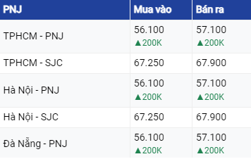 Giá vàng SJC ở khu vực Hà Nội và Đà Nẵng niêm yết ở mức 67,45 triệu đồng/lượng mua vào và 68,07 triệu đồng/lượng bán ra. Tại TP Hồ Chí Minh, vàng SJC vẫn đang mua vào mức tương tự như ở khu vực Hà Nội và Đà Nẵng nhưng bán ra thấp hơn 20.000 đồng. Như vậy, so với rạng sáng trước đó, giá vàng SJC đã được điều chỉnh tăng 150.000 đồng.