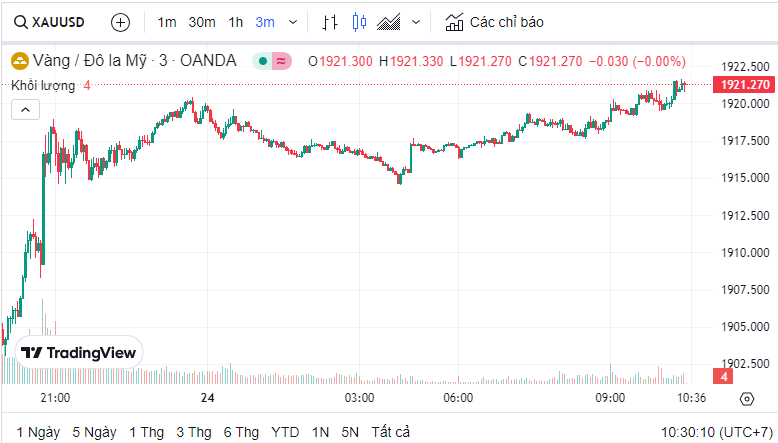 Giá vàng quốc tế (XAU) hôm nay là 1,921.54 USD (cập nhật lúc 10:29:03 24/08/2023).