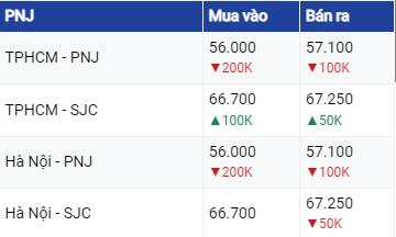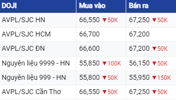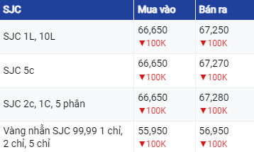 Tại Hà Nội, giá vàng SJC giao dịch mua - bán trong khoảng 66,65 – 67,25 triệu đồng/lượng. Các thị trường trên đều giảm 100.000 đồng/lượng chiều mua và chiều bán ra so với chốt phiên trước.