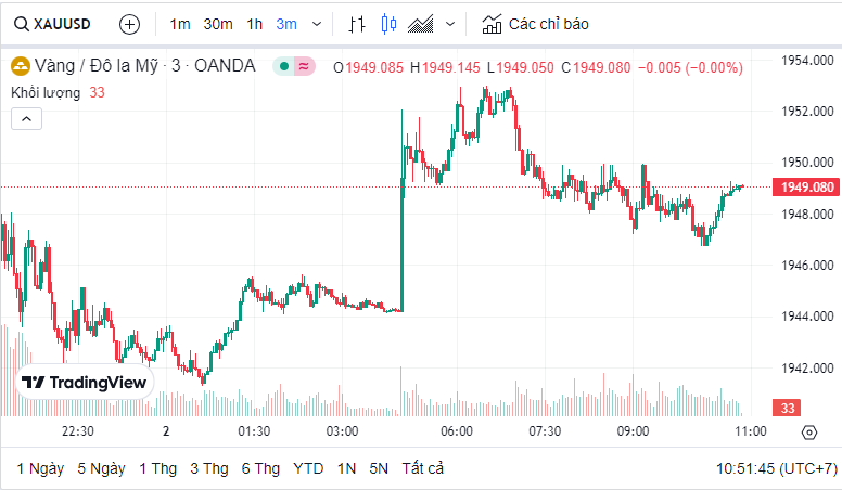 Giá vàng quốc tế (XAU) hôm nay là 1,949.10 USD (cập nhật lúc 10:50:48 02/08/2023).