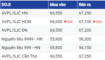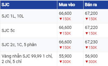 Vàng SJC ở khu vực Hà Nội và Đà Nẵng đang mua vào mức 66,6 triệu đồng/lượng và bán ra mức 67,22 triệu đồng/lượng. Tại TP Hồ Chí Minh, vàng SJC vẫn đang mua vào mức tương tự như ở khu vực Hà Nội và Đà Nẵng nhưng bán ra thấp hơn 20.000 đồng. Như vậy, so với rạng sáng ngày trước đó, giá vàng SJC đã được điều chỉnh giảm 150.000 đồng ở cả 2 chiều.