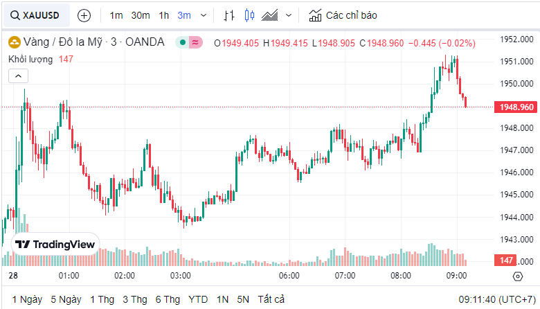 Giá vàng quốc tế (XAU) hôm nay là 1,949.32 USD (cập nhật lúc 09:11:00 28/07/2023).
