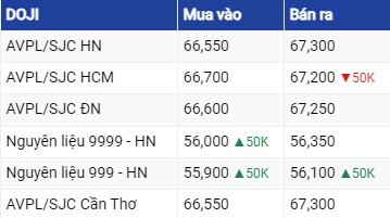 Vàng DOJI tại khu vực Hà Nội đang mua vào mức 66,55 triệu đồng/lượng và bán ra mức 67,3 triệu đồng/lượng. Tại TP Hồ Chí Minh, vàng thương hiệu này đang mua vào cao hơn 150.000 đồng nhưng bán ra thấp hơn 50.000 đồng so với khu vực Hà Nội.